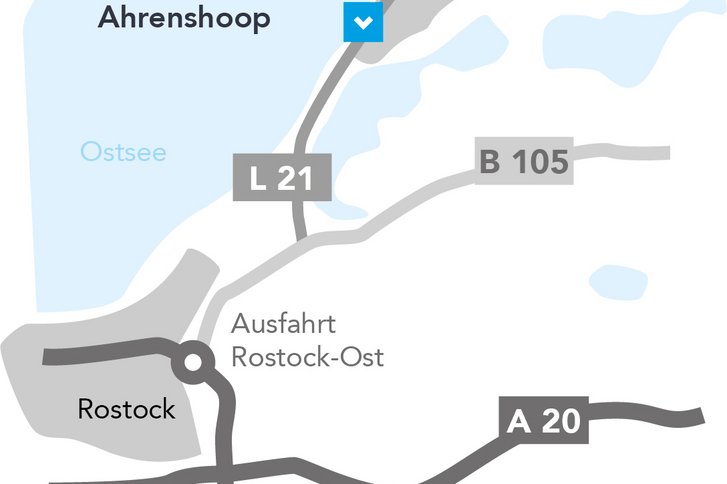Sie erreichen uns über die A20 Lübeck/Kreuz Rostock bzw. Wittstock/Rostock-Ost. Dann fahren Sie die B105 Richtung Ribnitz-Damgarten bzw. Stralsund. Vor Ribnitz-Damgarten (Altheide) biegen Sie ab in Richtung Fischland zur Weiterfahrt über Dierhagen und Wustrow ins Ostseebad Ahrenshoop.