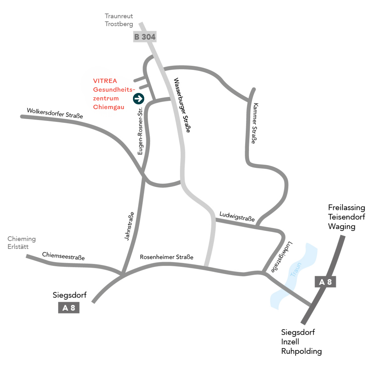Von der A8 kommend, nehmen Sie die Ausfahrt 112 Traunstein/Siegsdorf und fahren auf der B306 bis Traunstein. Mit dem Auto brauchen Sie ca. 10 Minuten zum VITREA Gesundheitszentrum Chiemgau.