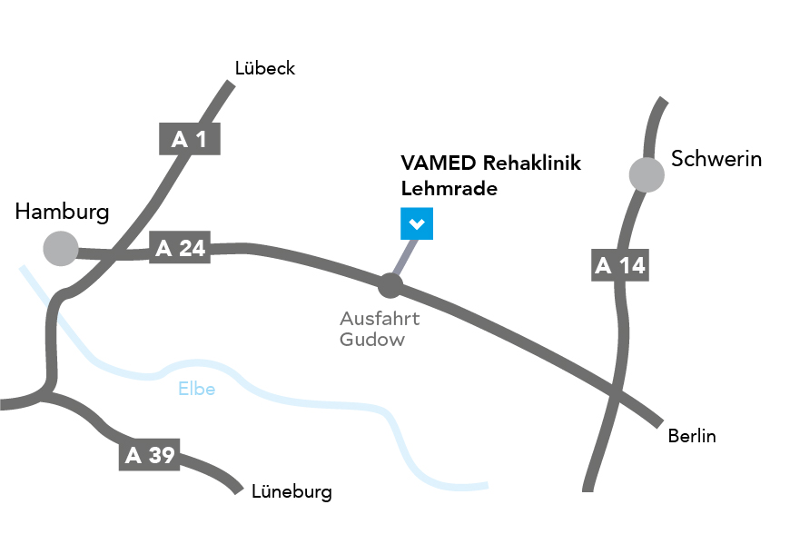 Aus Richtung Hamburg und Berlin erreichen Sie uns über die Autobahn A 24. Benutzen Sie die Abfahrt Gudow (8b) und fahren Sie dann über Gudow nach Lehmrade. Das Klinikgelände befindet sich in der Ortsmitte und ist ausgeschildert.